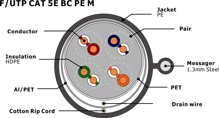 | Khiên: | FTP, cặp xoắn được bảo vệ | Tên sản phẩm: | F/UTP CAT5E PE có trình nhắn tin |